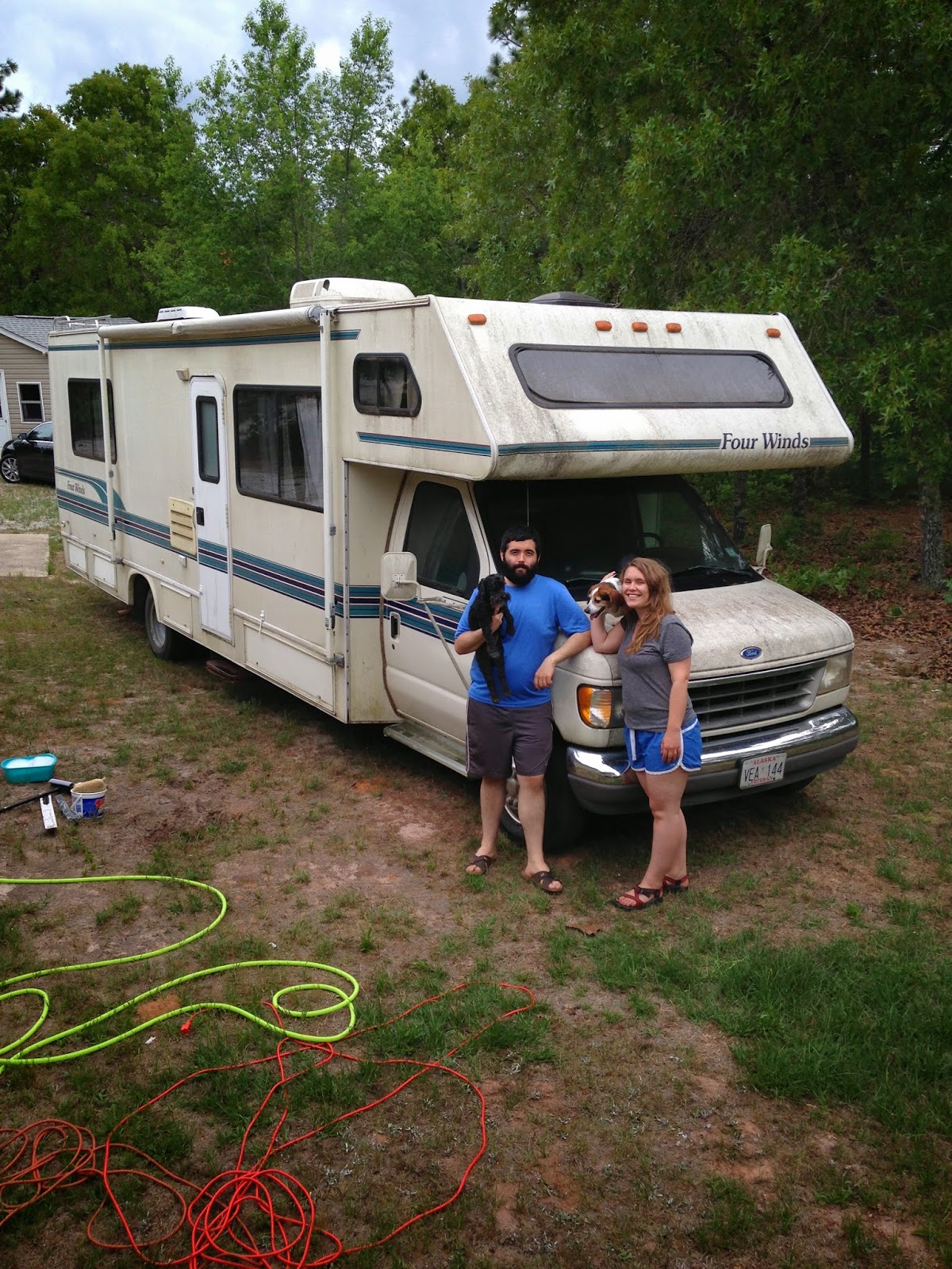 Fast forward to a week ago. We were at my mom's cabin in North Carolina visiting when her husband looked at Nick and I and said, "Do you want an RV?" Nick and I looked at each other with wide somewhat disbelieving eyes. Um, yes? Nick had already floated this idea to me in passing a couple of weeks previous, but I had dismissed it immediately because the start up expense would deplete our precious savings. Greg (stepdad/mom's husband) went on to inform us that his mother had an RV she wanted to get rid of and would basically give it to us (well, sell it to us for a $1 to make it legal). Immediately, I jumped out of my skin with relief and excitement. Our own little snail shell? A home we could take with us wherever we went? Perfection.